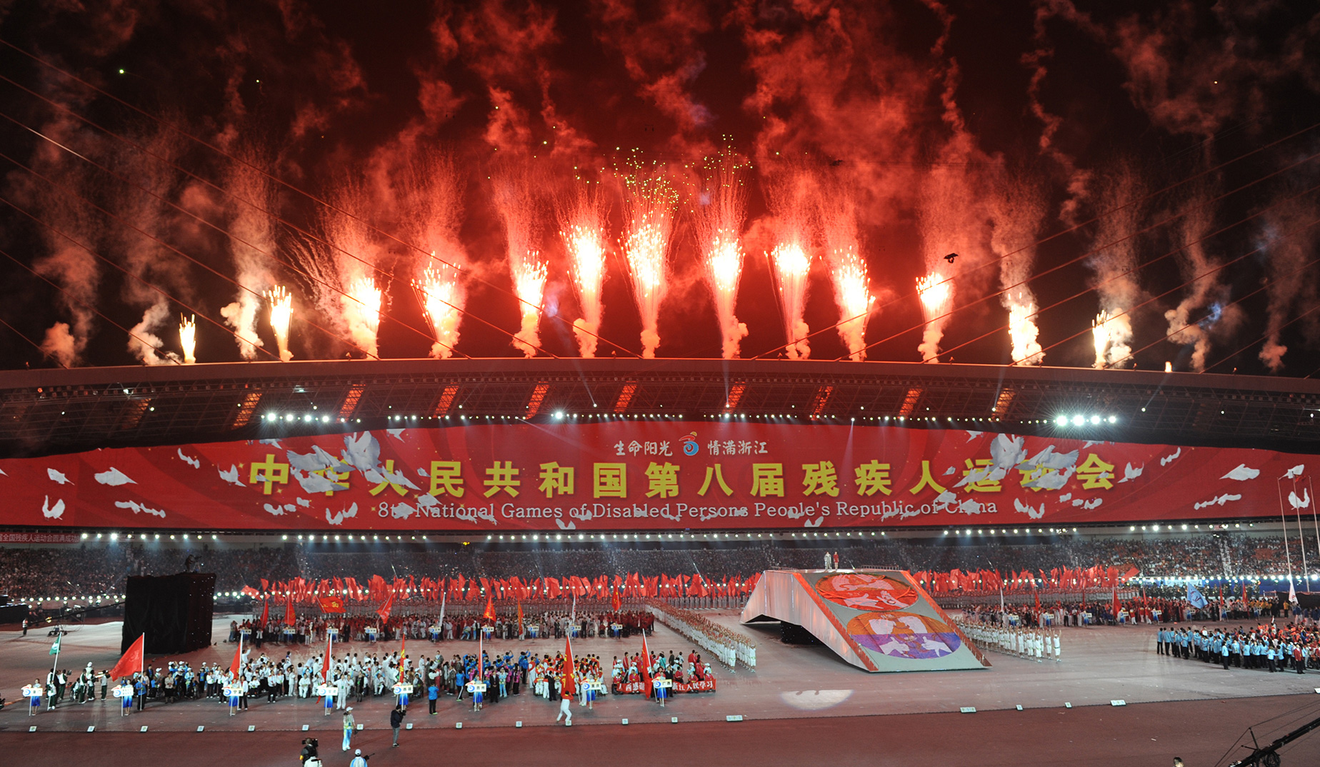 10月11日,第八届全国残疾人运动会开幕式在黄龙体育中心隆重开幕。