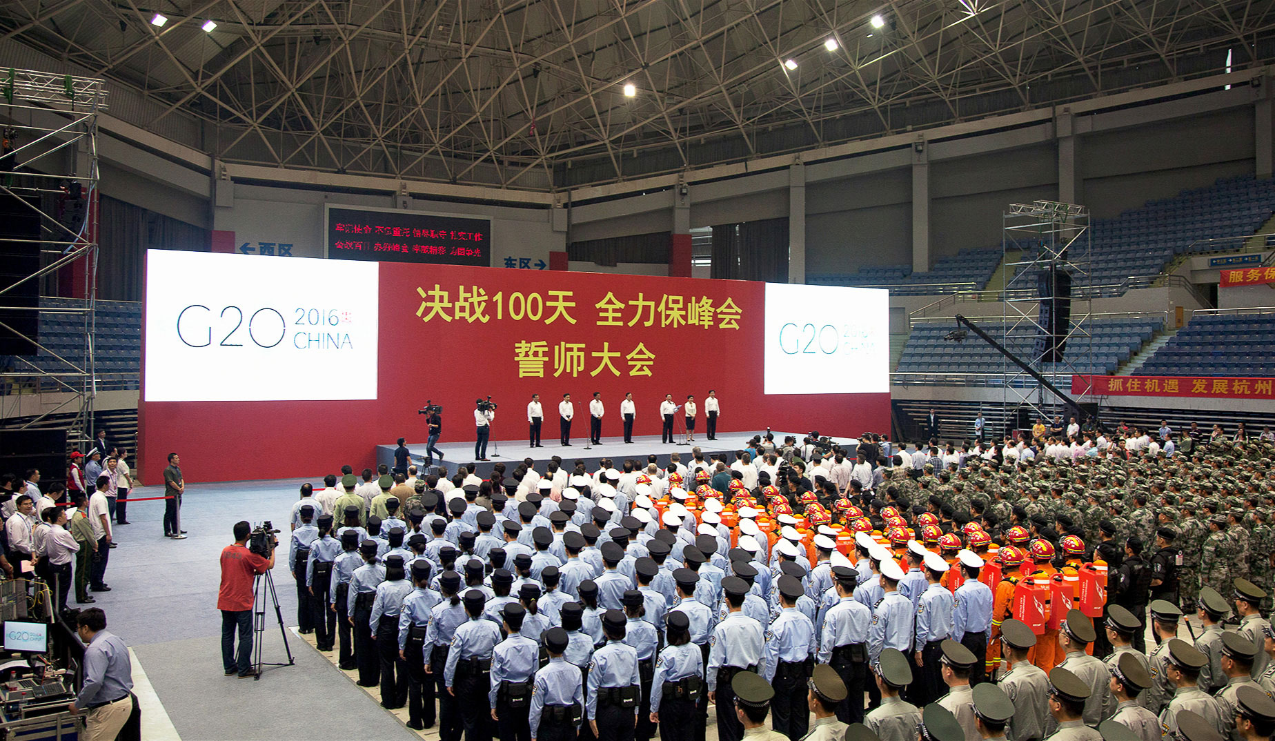 5月27日上午“决战100天 全力保峰会”G20誓师大会在黄龙体育馆圆满举行;峰会结束后,黄龙体育中心受到驻地部队的高度肯定和表扬。
