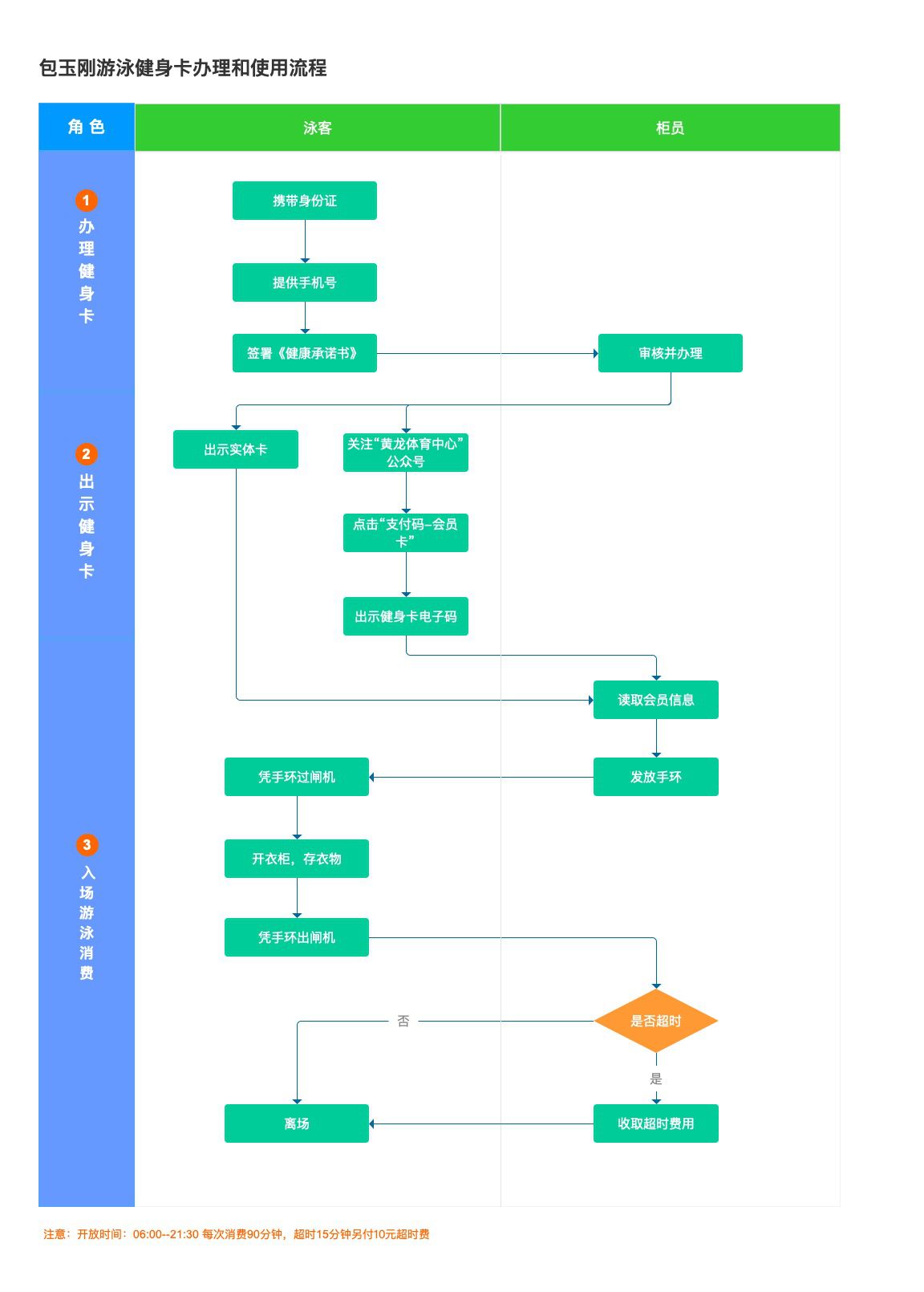 面向老年人开放时间:星期一至星期日 上午 7:00-12:00 面向50-69周岁老人:年卡300元/年 或4元/次 面向70周岁以上老人:免费 面向社会开放时间:无 备注:
