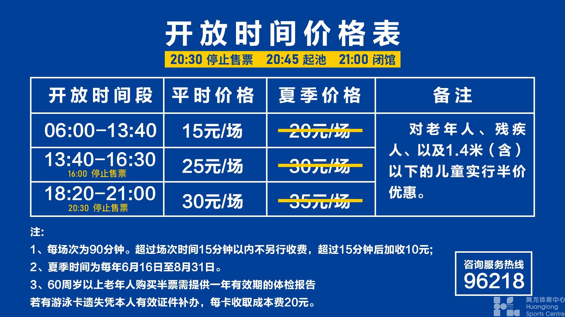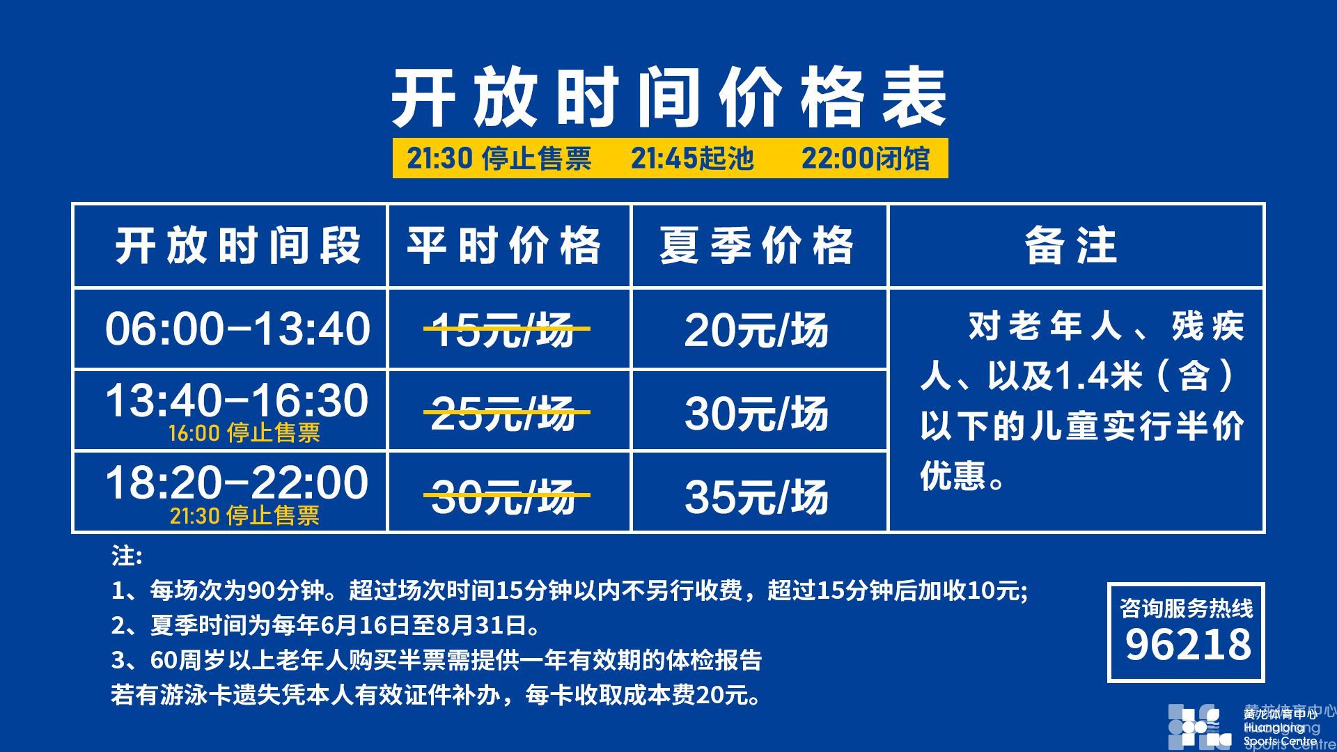 面向老年人开放时间:无 面向50-69周岁老人:无 面向70周岁以上老人:无 面向社会开放时间:周一至周五7:00-17:00 (130元/小时)17:00-22:00(160元/小时)双休、节假日7:00-22:00(160元/小时) 备注:
