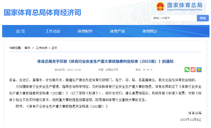 为进一步强化体育行业安全生产管理,国家体育总局日前印发《体育行业安全生产重大事故隐患判定标准(2023版)》,要求体育行业有关部门对照标准,结合工作实际细化落实相关要求,组织重大事故隐患排查治理,防范遏制体育行业重特大事故发生。