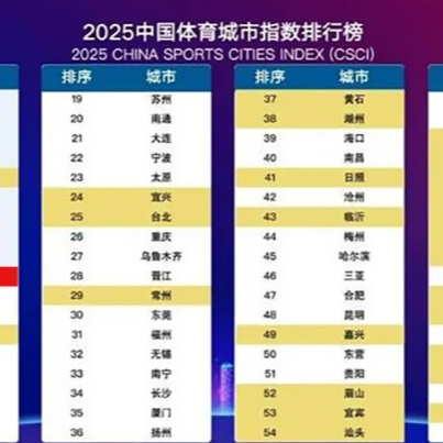 近日,“2025全球体育城市指数排行榜(2025 GSCI)”与“2025中国体育城市指数排行榜(2025CSCI)”由上海体育大学正式发布。其中,中国榜单头部梯队稳中有变,杭州继续上一年的优异表现,排名第3。令人惊喜的是,绍兴首次跻身中国体育城市第一梯队,排名第10。