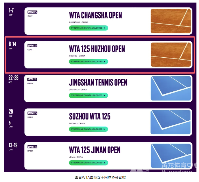 今年9月至10月期间,共有五站全新WTA125级别赛事将在中国举办,分别是长沙站、湖州站、京山站、苏州站和济南站。其中,京山、苏州和济南三站为硬地赛事,长沙、湖州为红土赛事。