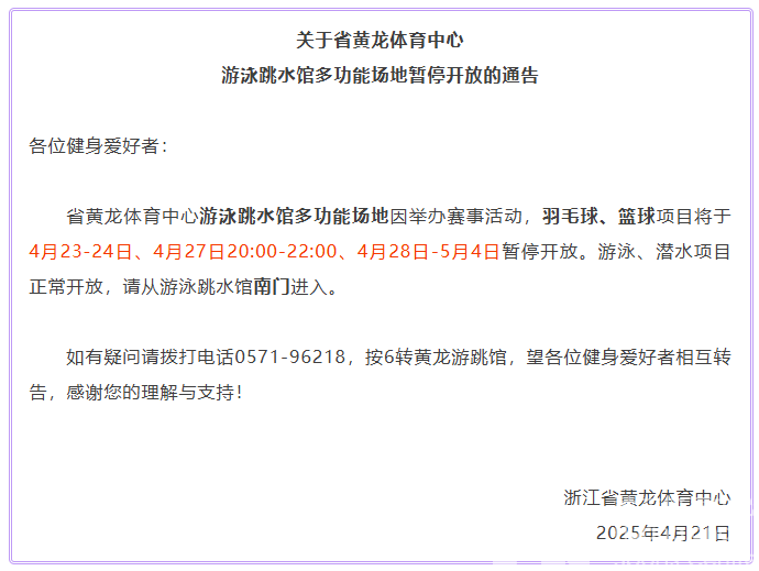 省黄龙体育中心游泳跳水馆多功能场地因举办赛事活动,羽毛球、篮球项目将于4月23-24日、4月27日20:00-22:00、4月28日-5月4日暂停开放。游泳、潜水项目正常开放,请从游泳跳水馆南门进入。
