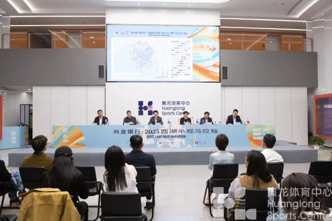 4月25日晚,兴业银行·2025西湖半程马拉松新闻发布会在省黄龙体育中心举行。