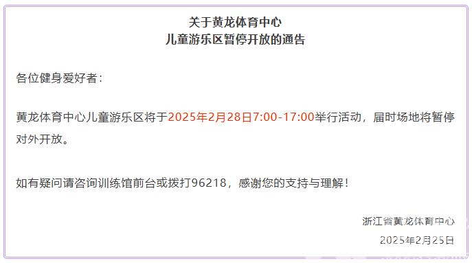 黄龙体育中心儿童游乐区将于2025年2月28日7:00-17:00举行活动,届时场地将暂停对外开放。