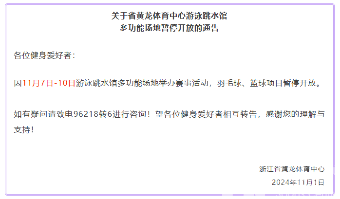 因11月7日-10日游泳跳水馆多功能场地举办赛事活动,羽毛球、篮球项目暂停开放。