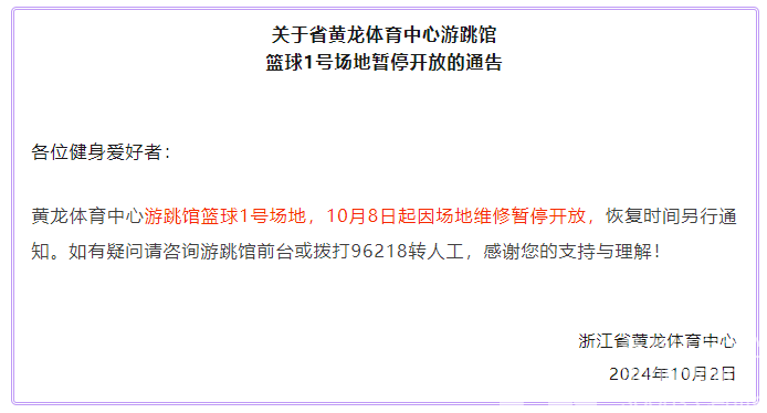 黄龙体育中心游跳馆篮球1号场地,10月8日起因场地维修暂停开放,恢复时间另行通知。