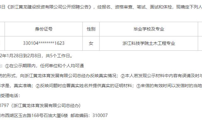 浙江黄龙建设投资有限公司拟聘人员公示