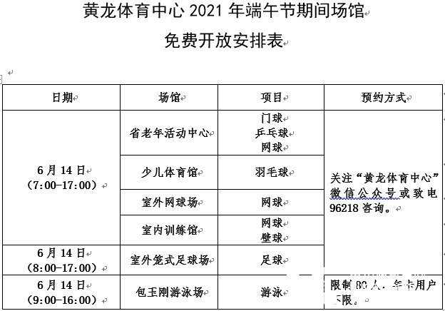 黄龙体育中心2021年端午节期间场馆免费开放安排