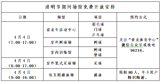 黄龙体育中心2020年清明节期间场馆免费开放安排
