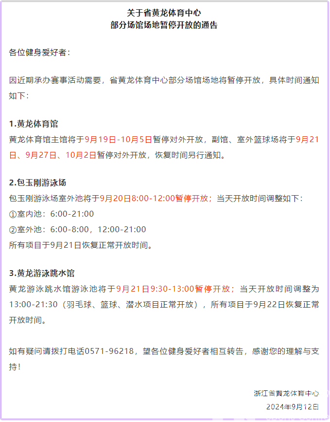 关于省黄龙体育中心部分场馆场地暂停开放的通告