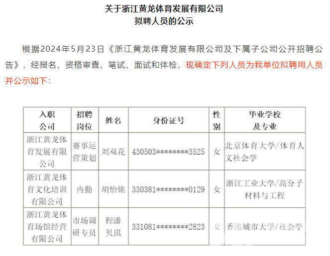 关于浙江黄龙体育发展有限公司拟聘人员的公示