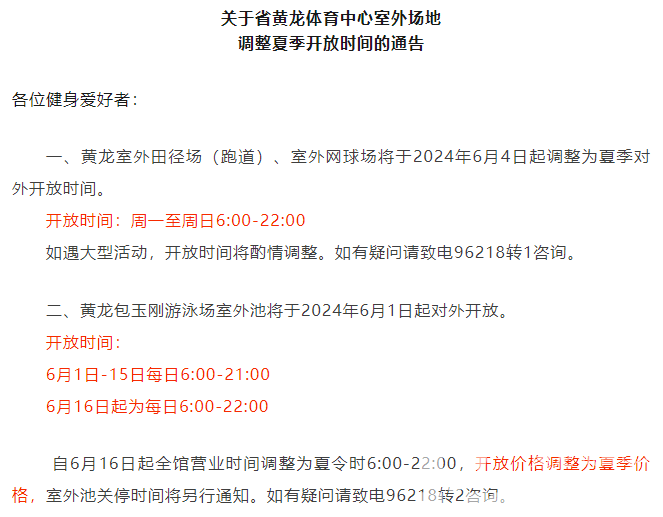 关于省黄龙体育中心室外场地调整夏季开放时间的通告