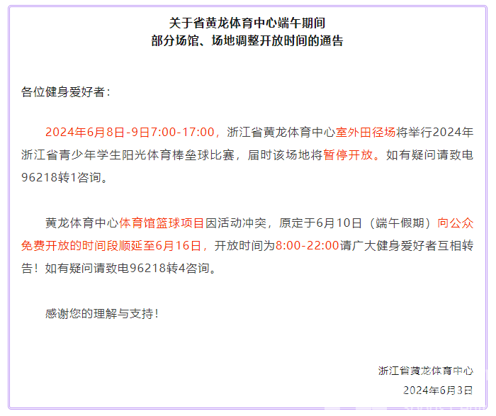 关于省黄龙体育中心端午期间部分场馆、场地调整开放时间的通告