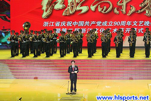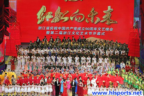 风雨兼程的九十年,你的容颜依然漂亮;风华绝代的九十年,明天续写壮丽辉煌。”这是浙产红色电视剧《中国1921》主题歌《开始》中的歌词。这个“开始”,讲的正是从嘉兴南湖开始的中国共产党建党之路。在中国共产党成立90周年华诞前夜,作为我党“红船”的起航地,浙江省也为我党献上了一份大礼——浙江省庆祝中国共产党成立90周年文艺晚会暨第二届浙江文化艺术节开幕式在杭州黄龙体育中心隆重举行。